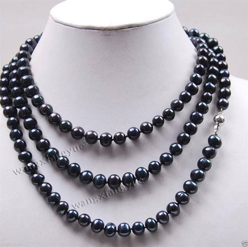 Free shipping Long 50" 7-8mm Black Akoya Cultured Pearl Jewelry Necklace