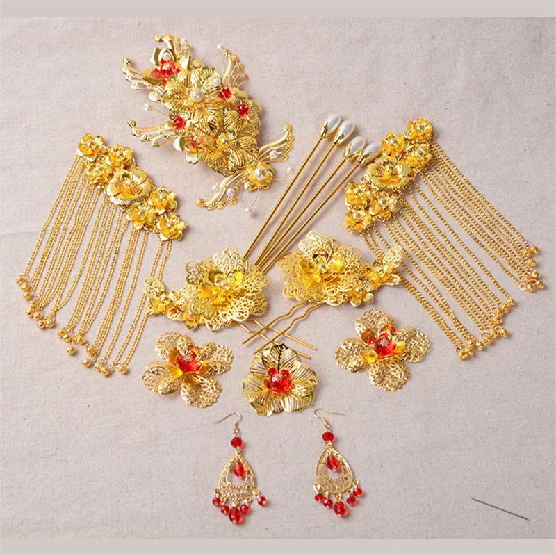 AINILIDAN Chinese Style Red Crystal Bridal Jewelry Sets Headdress Hair Accessories Imitation Pearl