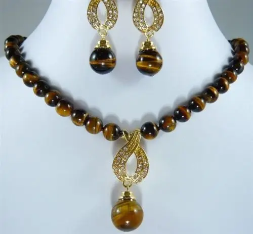 BEST QUALITY Prett Lovely Women's Wedding shipping> >10MM tiger's eye beads earring set silver-jewelry