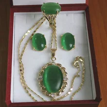 HOT Sale Wonderful Women Natural green color shot opal jewelry sets necklaces rings earrings 18KGP Fine wide