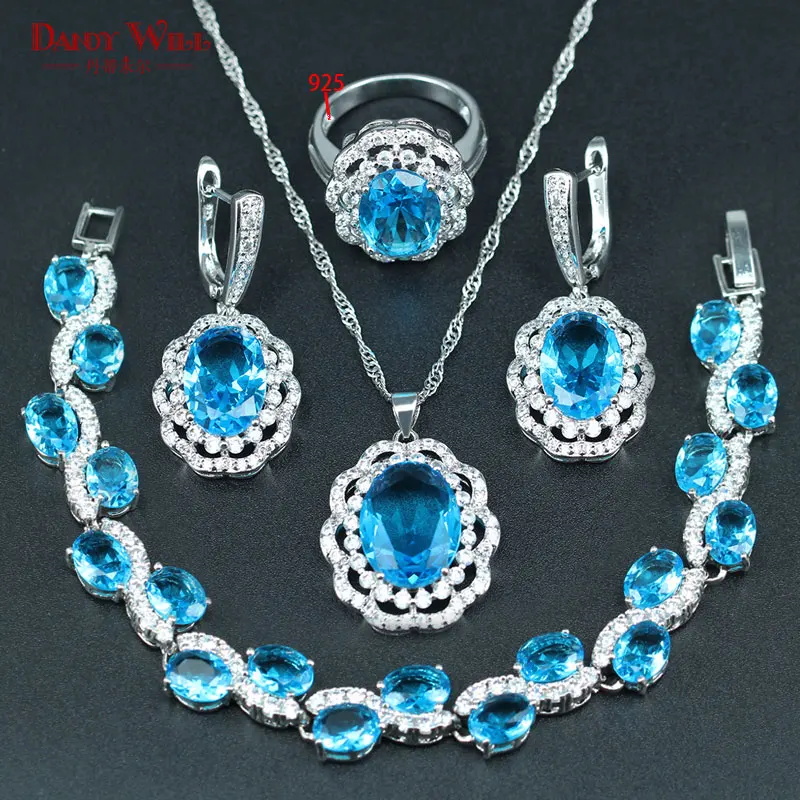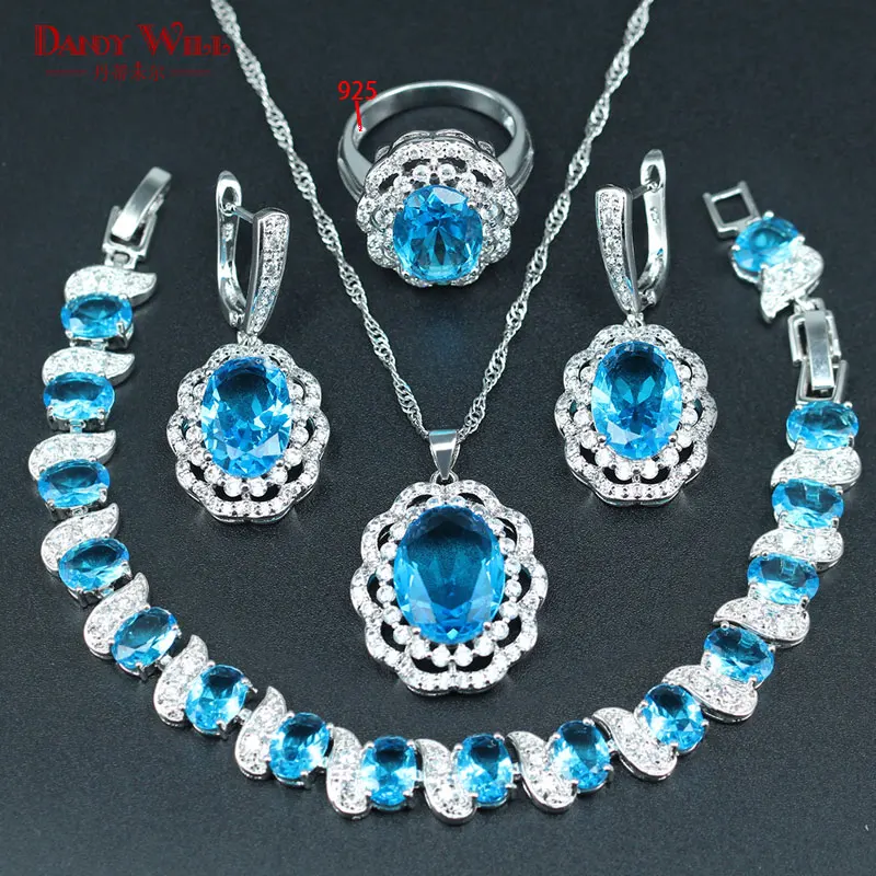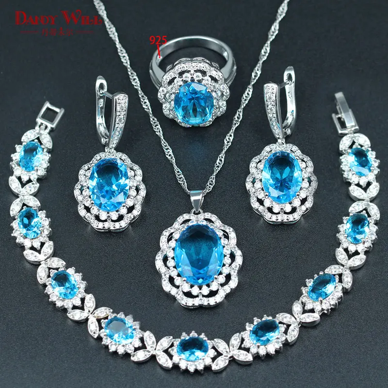 HOT SALE DANDY WILL Sky Blue Cubic Zirconia Necklace/Earrings/Ring/Bracelet/Pendant Set Silver 925 Stamp Col