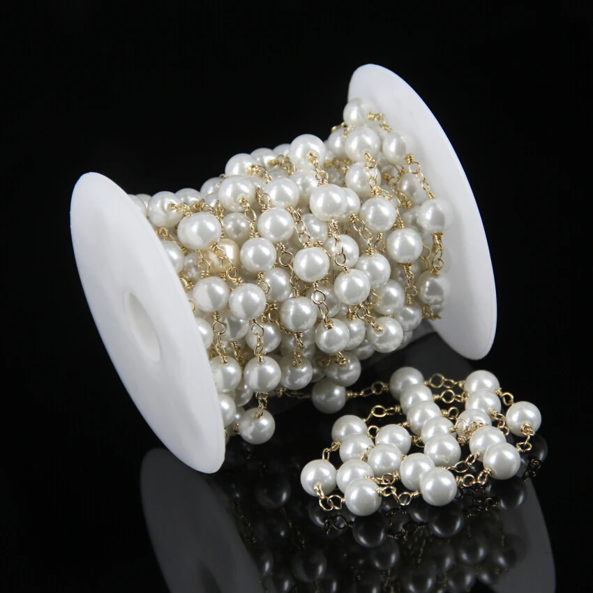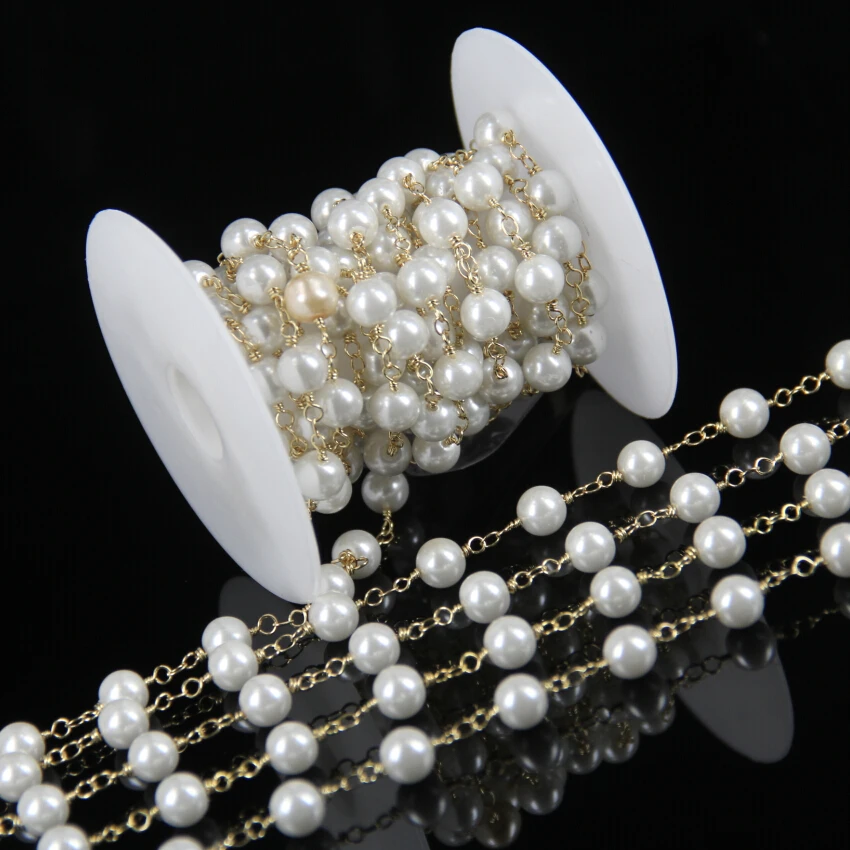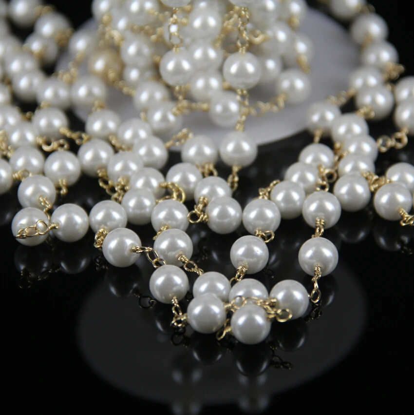 Best Wire Wrapped Beaded Chain Gold Tone Rosary Chain Imitation White Glass Pearl Chain 8mm Round Beads